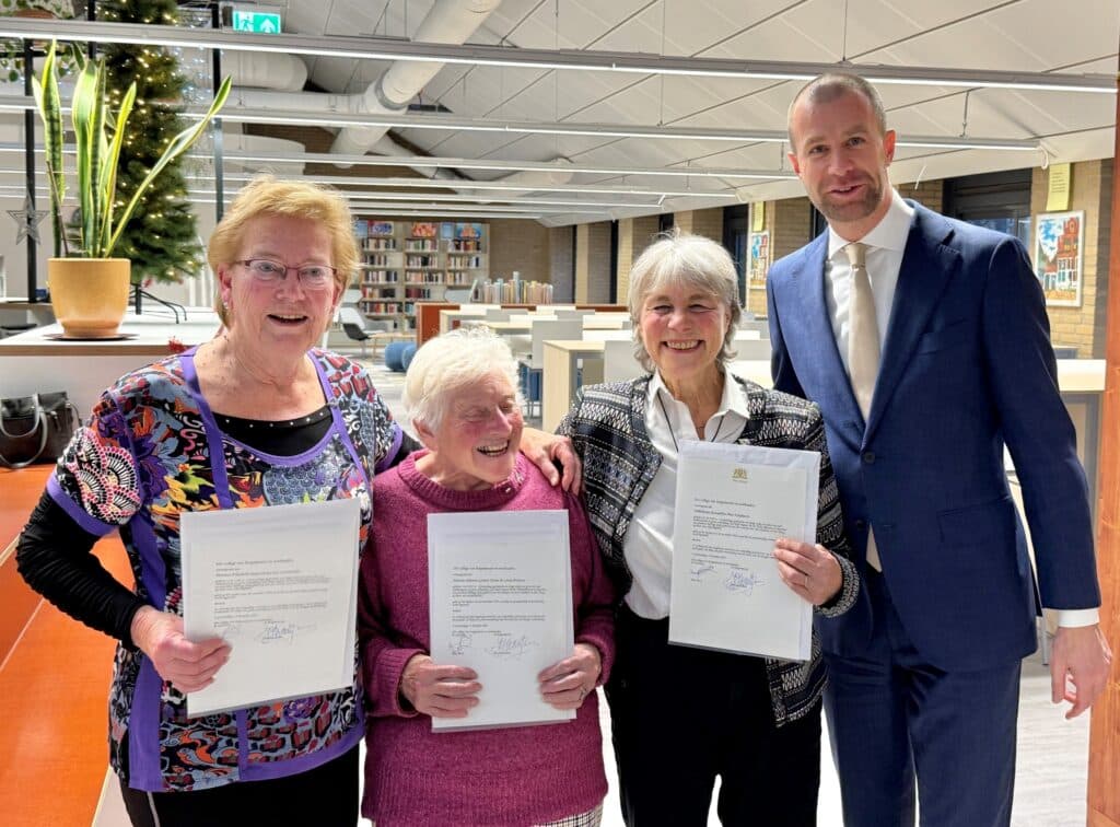 Drie vrijwilligers van de Mediatheek van Hofstad Lyceum kregen vanmiddag de Haagse Stadsspeld uitgereikt door Hilbert Bredemeijer, wethouder Onderwijs, Jeugd, Sport en Dienstverlening.